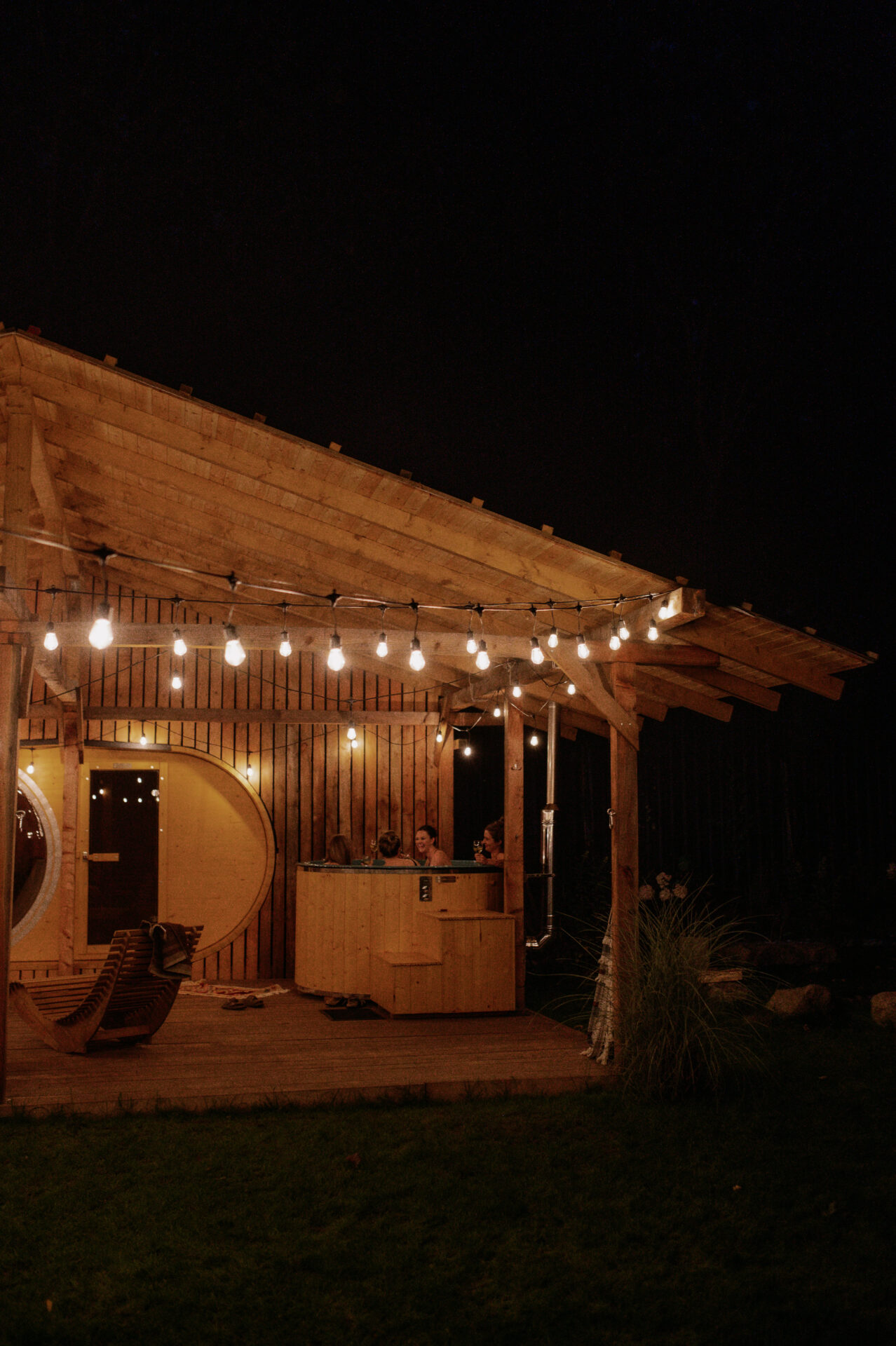 Balia zbudowana z solidnego drewna. Ta gorąca beczka pomieści 6-8 osób, zapewniając intymność i komfort podczas zanurzania się w ciepłej wodzie.